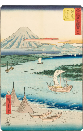現在の静岡県中部の広大な範囲に該当する江戸時代の駿河国は、富士山や駿河湾など雄大な地形を有し、景勝地や旧跡など多くの名所が点在していました。本展では歌川広重が手掛けた東海道シリーズを中心に駿河国(沼津~島田)を描いた浮世絵を紹介します。様々な駿河の風景やそこに生きる人々の風俗をお楽しみください。